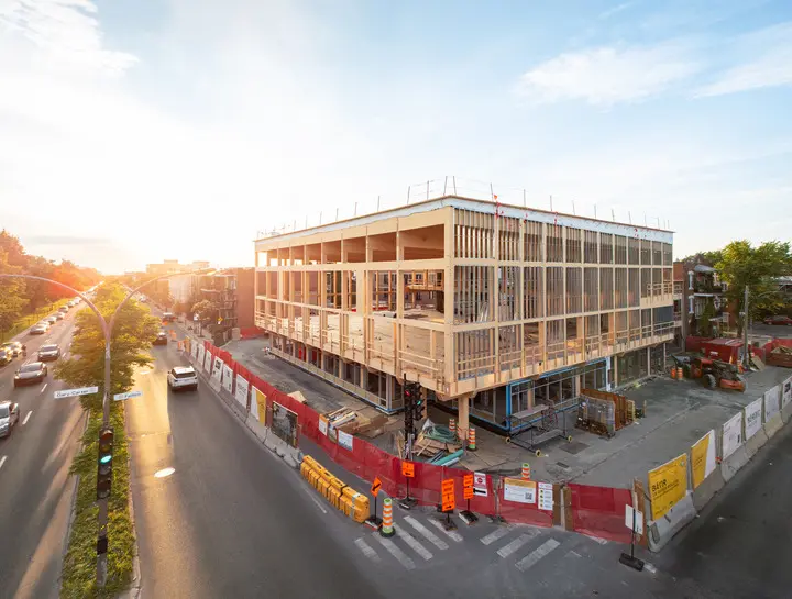 - Carbone intrinsèque : collaboration étroite avec les architectes (Kanva) et les ingénieurs en structure (Leroux+Cyr) afin de réduire de plus de 20% les émissions de carbone intrinsèque, grâce notamment à la structure de lamellé-collé.