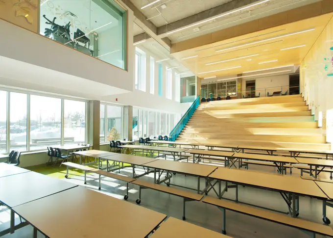 L’école innovatrice L’Agora-Tourterelle regroupe l’école primaire Tourterelle et l’école secondaire de l’Agora sous un même toit ultramoderne d’environ 7 500 m². Le bâtiment contemporain sur trois étages intègre 31 classes, des espaces collaboratifs, une bibliothèque, un gymnase double avec scène, un atelier culinaire et un espace central lumineux sur deux niveaux. L’aménagement écologique des eaux pluviales transforme les gradins du bassin de rétention en salle de jeux et classe extérieure.