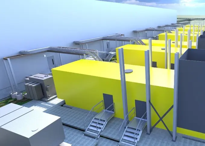 This self-contained data center includes an electrical distribution system feeding eight 2 MW lines to provide the required electrical capacity for the facilities. The site is supplied by two separate 25 kV underground power inlets.