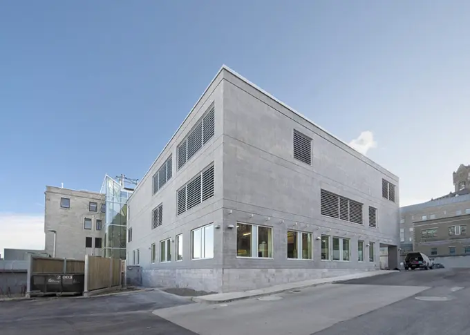In addition to specialized systems and equipment, the project includes innovative infrastructures such as the recovery of fume hood exhaust to preheat outside air, a laboratory effluent treatment system, distilled purified water and osmosis water networks, “clean” steam production, and efficient lighting throughout the building.