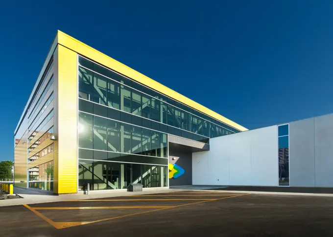The Stinson Bus Garage, built to accommodate growing ridership, accommodates 300 buses, including 100 articulated buses, and provides workspace for 800 employees. This building was designed to accommodate electric and hybrid buses and electric minibuses. It is the first building designed and operated exclusively for internal traffic, minimizing the impact of fleet movement on the neighbourhood. The 38,400 m² building includes an internal parking area, a repair shop area with seven bays for articulated buses and 10 bays for regular buses, plus additional bays for interior washing, steam washing, tire changing and bodywork, three refuelling areas and two bus washes, as well as technical rooms and a programmable strip for the office areas, rest rooms and mechanical rooms.