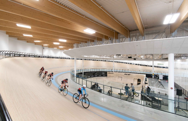 The velodrome minimizes its environmental impact by using electricity as its heating source, emitting as little as 2.9 tonnes of CO2 per year.
