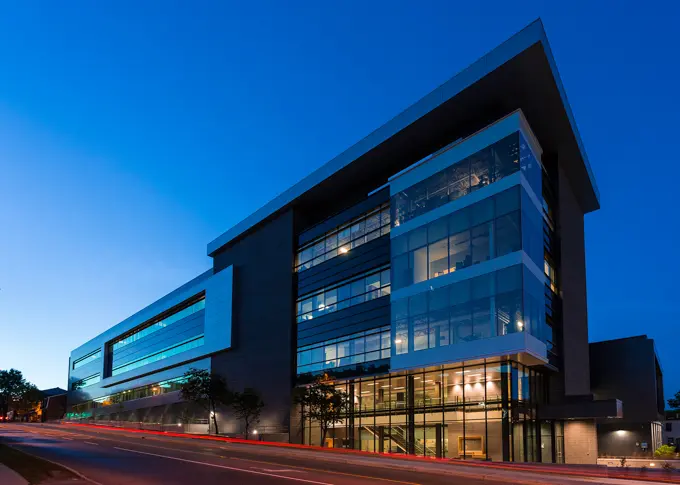 The five-storey 14,000m2 ARC building is a science research facility at the University of Ottawa for Advanced Photonics and Environmental Analysis that complements the Faculty of Earth Sciences, Physics and Engineering. The facility houses classrooms, a cleanroom for laser testing, cold rooms and laboratories dedicated to inert gas research and analysis of glacial specimens, as well as Canada’s only accelerator mass spectrometer, a $3M instrument for kinetic energy conversion.